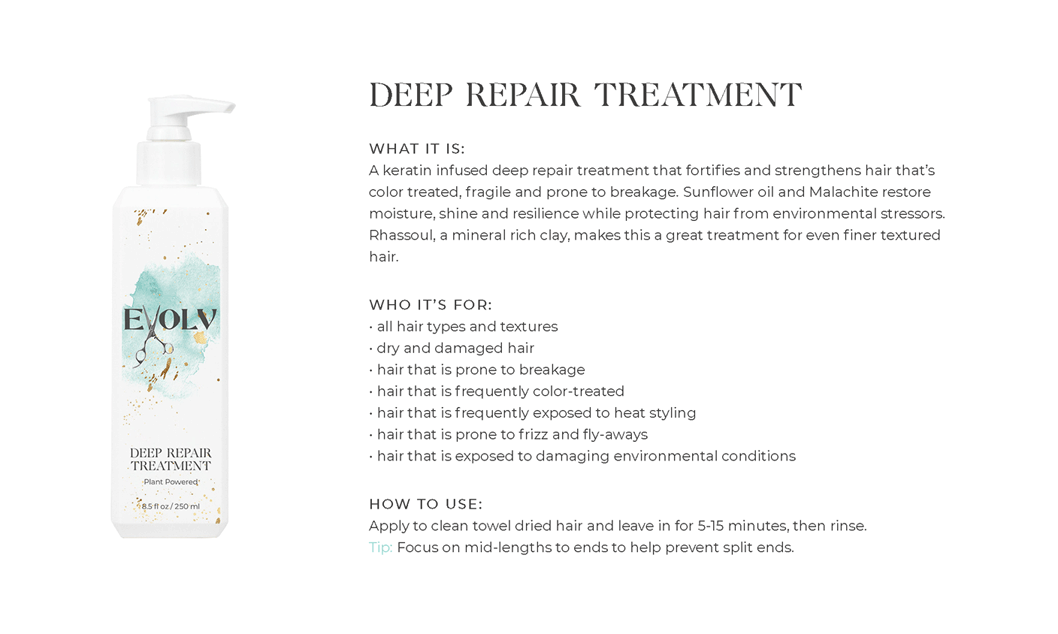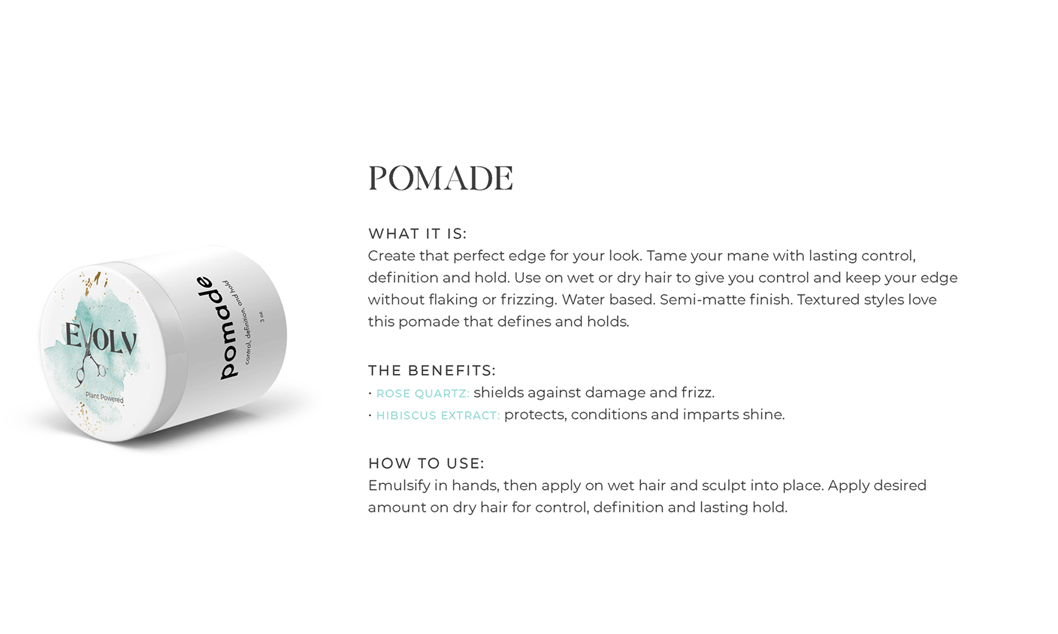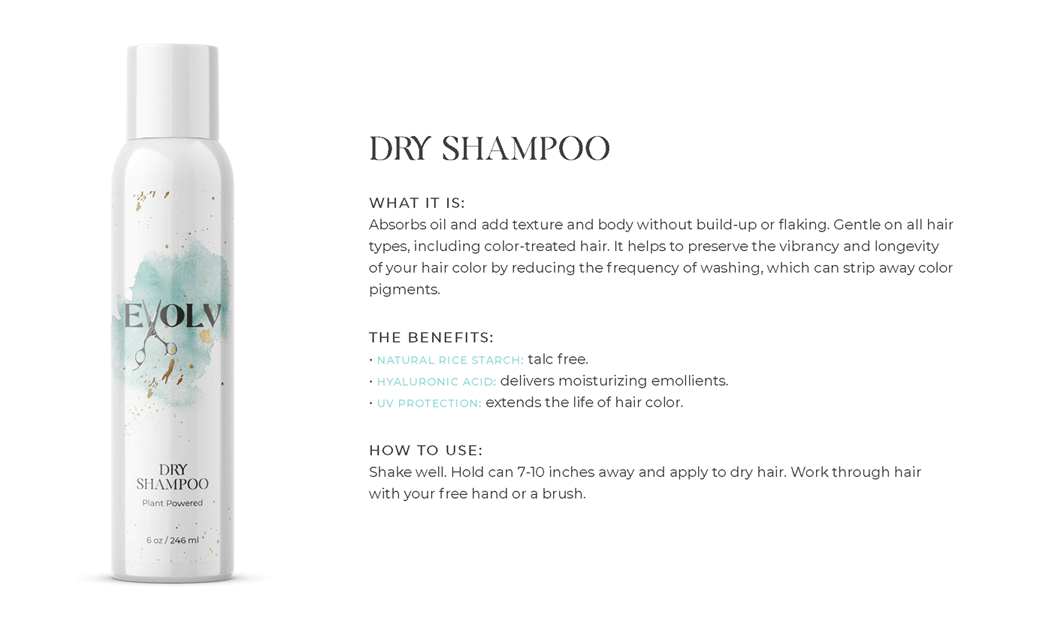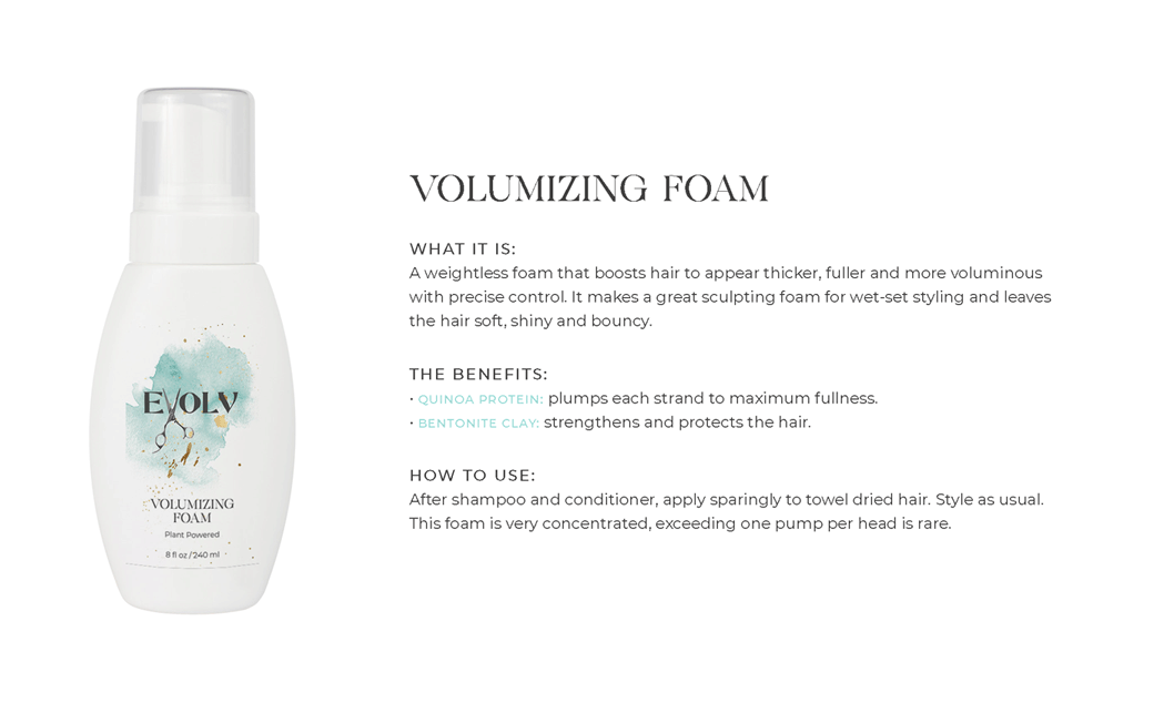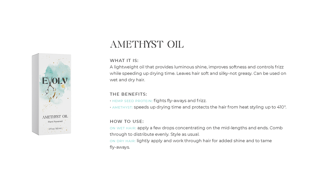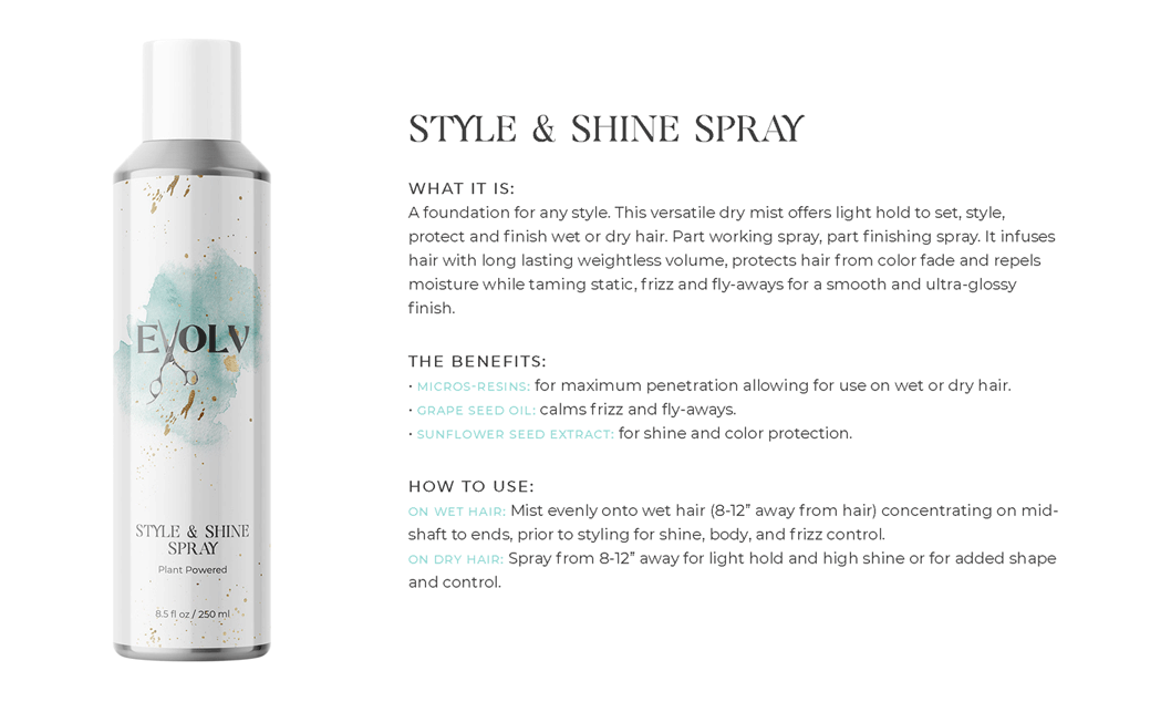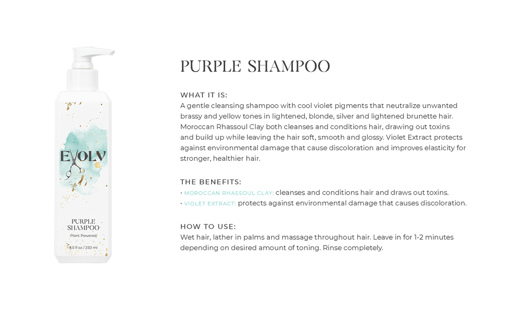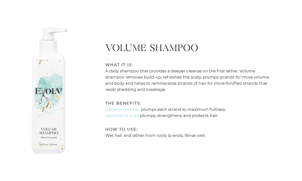 EVOLV HAIR PRODUCTS - Click each product title for more information. Purple Shampoo: cleanses & conditions while removing build up & neutralizes brass/yellow Volume Shampoo: quinoa (strength)& bentonite clay (plumps the strands) Volume Conditioner: plumps, strengthens & protects against breakage Moisture Shampoo: has collagen (to seal in hair cuticle & prevent color fade) & sunflower seed extract (shine, repair) & coconut milk protein (silky smooth) Moisture Conditioner:argan oil (fly aways), hazelnut (helps prevent breakage) Deep Repair Treatment: keratin & rhassou clay Everyday Miracle Treatment: uv filters, sericite mica (smooths, seals, shine) Dry Shampoo: rice starch, hyaluronic acid Mousse - Volumizing Foam: heat protection, plumps Styling Cream: heat protection, reduces oily build up, pumpkin seed (strength), kaolin clay (absorbs oil) wet or dry Blow Dry Cream:heat protection, straight or curly, air dry or diffuse, pea protein (hydrates), jojoba oil (elasticity) Amethyst Oil: heat protection up to 410• adds shine Style & Shine Spray: repels moisture, grapeseed oil (frizz & fly aways), oat protein (amino acids and peptides moisture and nourish), soy protein (heat styling and uv) In Control Hairspray:humidity resistant, 3 strengths in 1 Pomade: semi matte wet or dry, rose quartz (shield damage or frizz), hibiscus extract ( condition, shine, protect) Flex Paste: carnauba wax (strengthens/control) damp or dry |