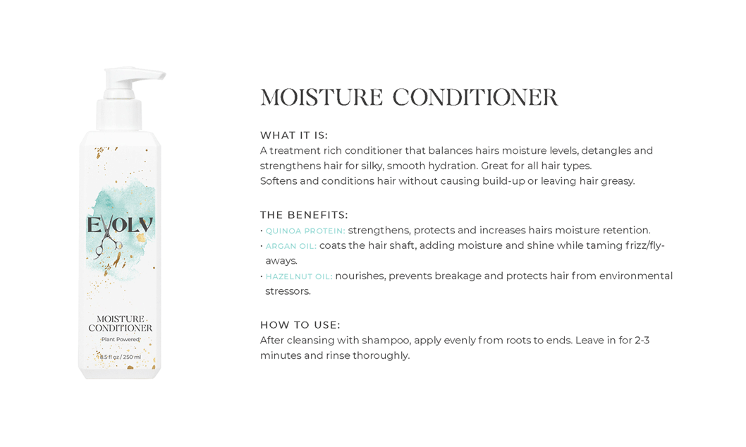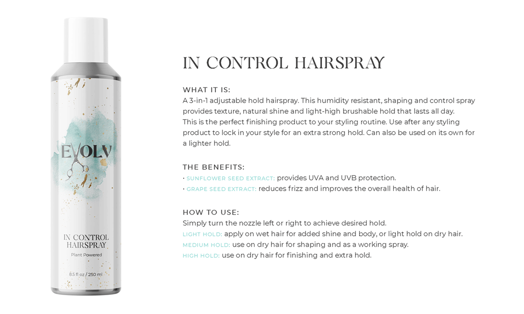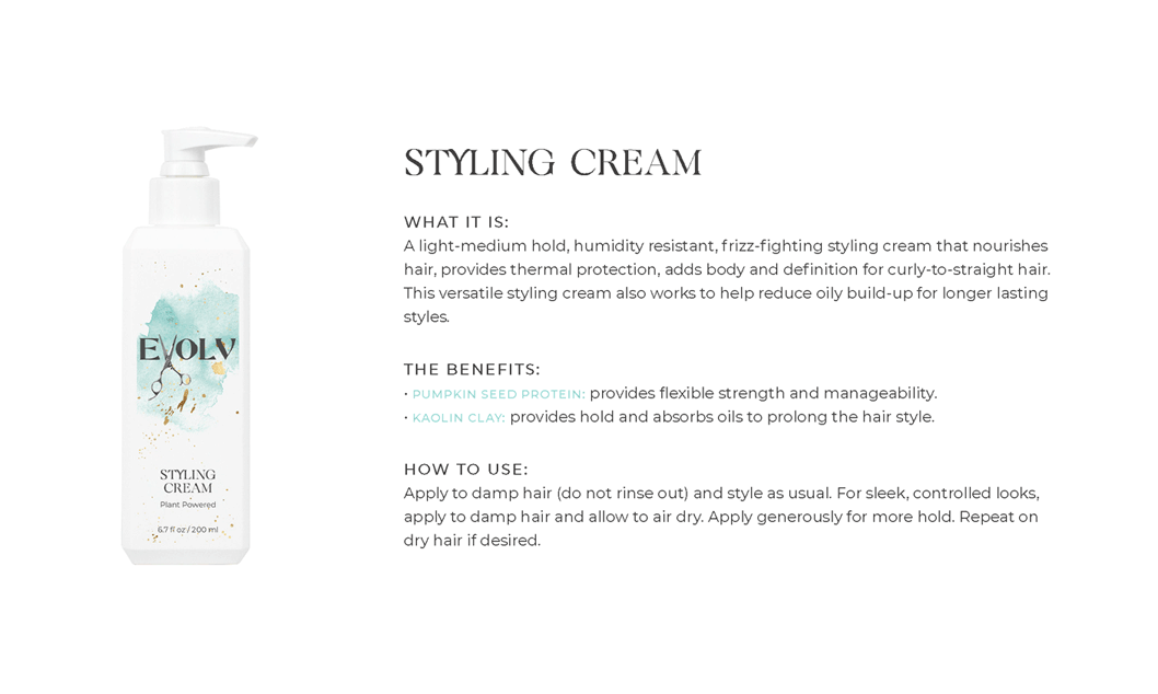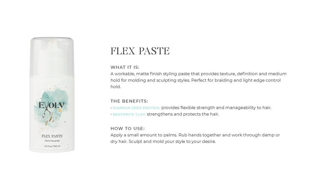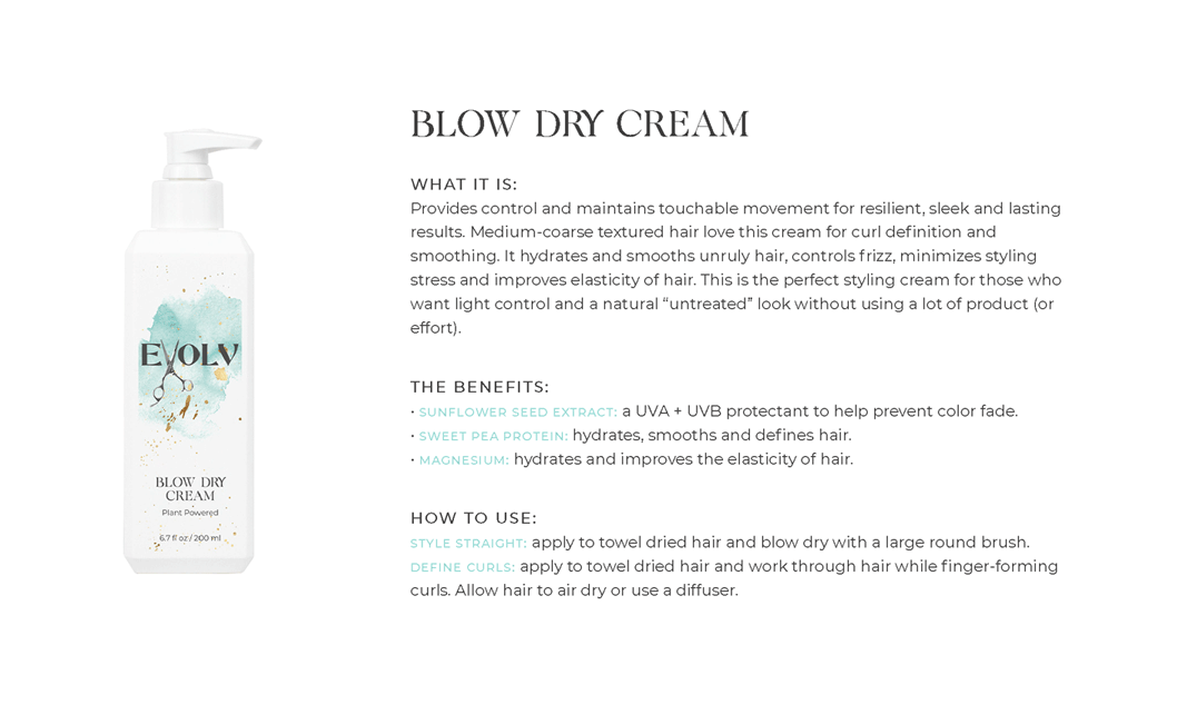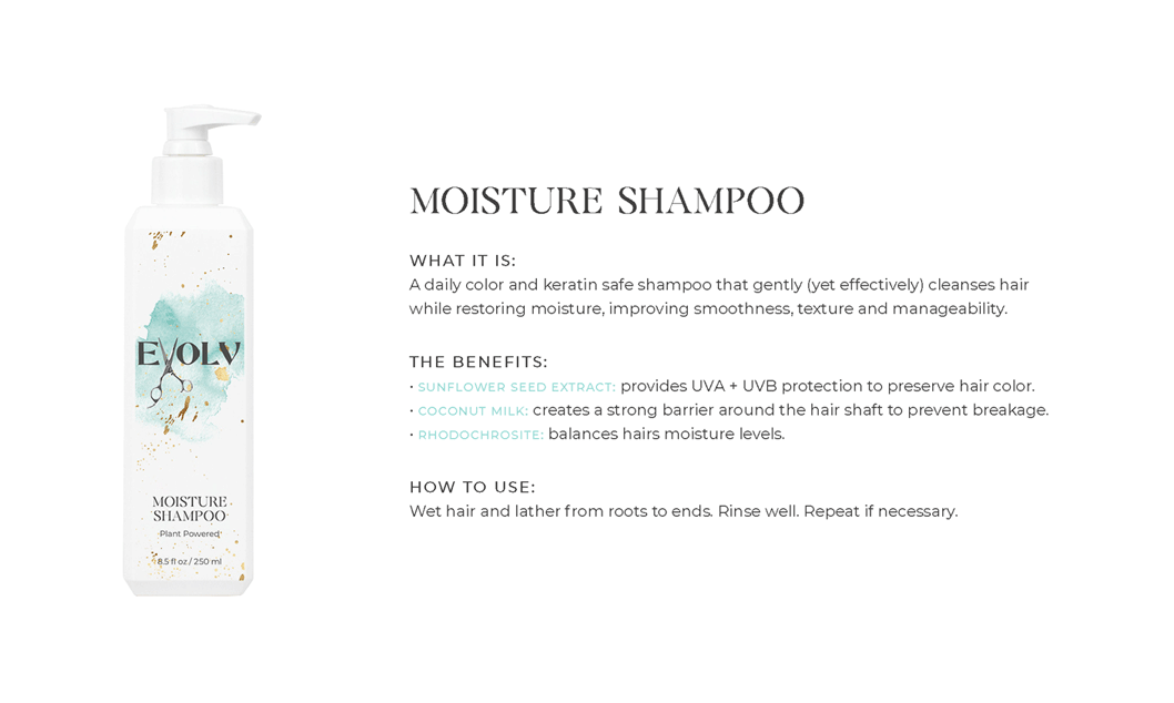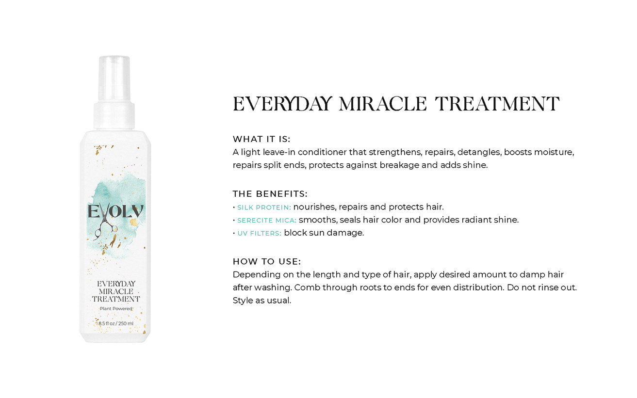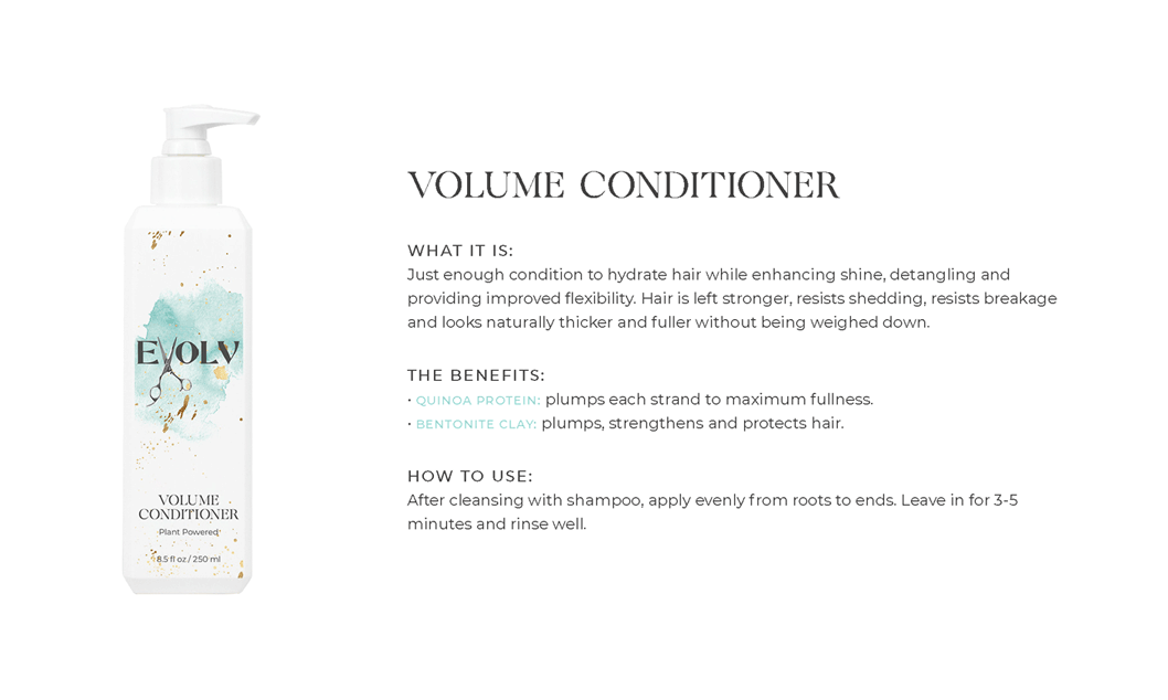 EVOLV HAIR PRODUCTS - Click each product title for more information. Purple Shampoo: cleanses & conditions while removing build up & neutralizes brass/yellow Volume Shampoo: quinoa (strength)& bentonite clay (plumps the strands) Volume Conditioner: plumps, strengthens & protects against breakage Moisture Shampoo: has collagen (to seal in hair cuticle & prevent color fade) & sunflower seed extract (shine, repair) & coconut milk protein (silky smooth) Moisture Conditioner:argan oil (fly aways), hazelnut (helps prevent breakage) Deep Repair Treatment: keratin & rhassou clay Everyday Miracle Treatment: uv filters, sericite mica (smooths, seals, shine) Dry Shampoo: rice starch, hyaluronic acid Mousse - Volumizing Foam: heat protection, plumps Styling Cream: heat protection, reduces oily build up, pumpkin seed (strength), kaolin clay (absorbs oil) wet or dry Blow Dry Cream:heat protection, straight or curly, air dry or diffuse, pea protein (hydrates), jojoba oil (elasticity) Amethyst Oil: heat protection up to 410• adds shine Style & Shine Spray: repels moisture, grapeseed oil (frizz & fly aways), oat protein (amino acids and peptides moisture and nourish), soy protein (heat styling and uv) In Control Hairspray:humidity resistant, 3 strengths in 1 Pomade: semi matte wet or dry, rose quartz (shield damage or frizz), hibiscus extract ( condition, shine, protect) Flex Paste: carnauba wax (strengthens/control) damp or dry |